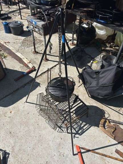 LOT 647 - Lodge camp tripod Stansport Dutch oven cast-iron lid lifter steel fire grate and cooker