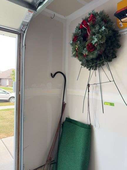 LOT 17053 - (2) 60" Shepard hooks, elec fence posts, wreath stands and green artifical "turf" carpet