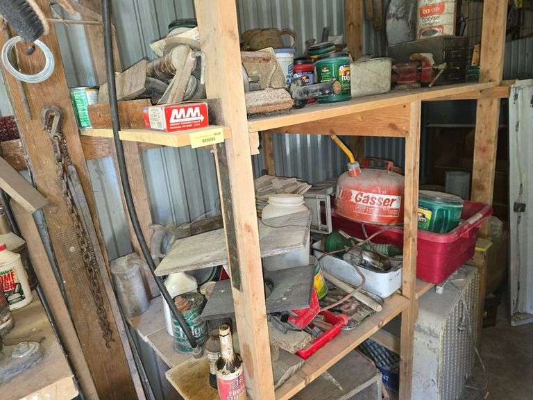 LOT 18520 - Shelf contents includes vise, planes, gas can, nuts, bolts, nails, etc