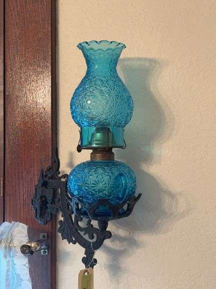 LOT 18205 - Cast iron wall bracket with blue glass daisy and button oil lamp