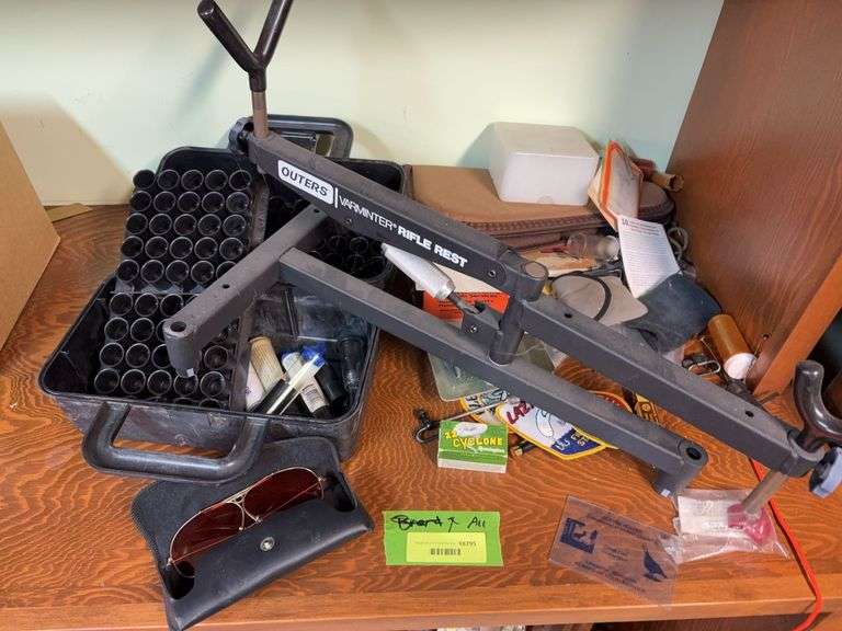 LOT 18795 - Gun rest, shell box, choke tubes, pistol case, and more