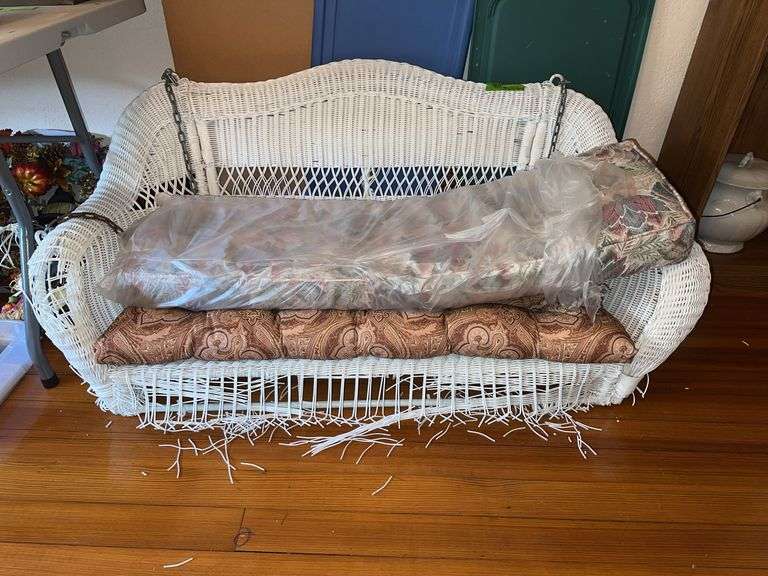 LOT 18270 - 45” long plicker porch swing and two cushions, needs work The plicker is very brittle