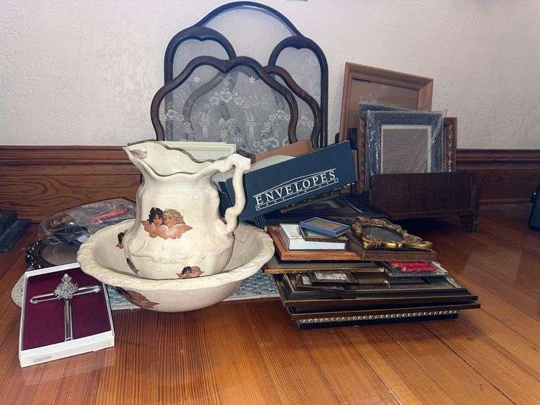 LOT 18279 - Pitcher & basin, picture frames, envelopes, etc
