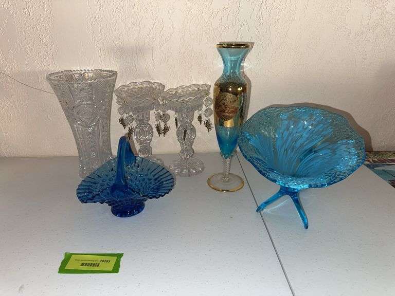 LOT 18285 - Blue hobnail basket, blue swirl cornucopia vase, blue & gold art glass vase, etc