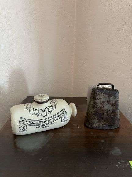 LOT 18290 - Antique cow bell and Doultons Improved Foot Warmer