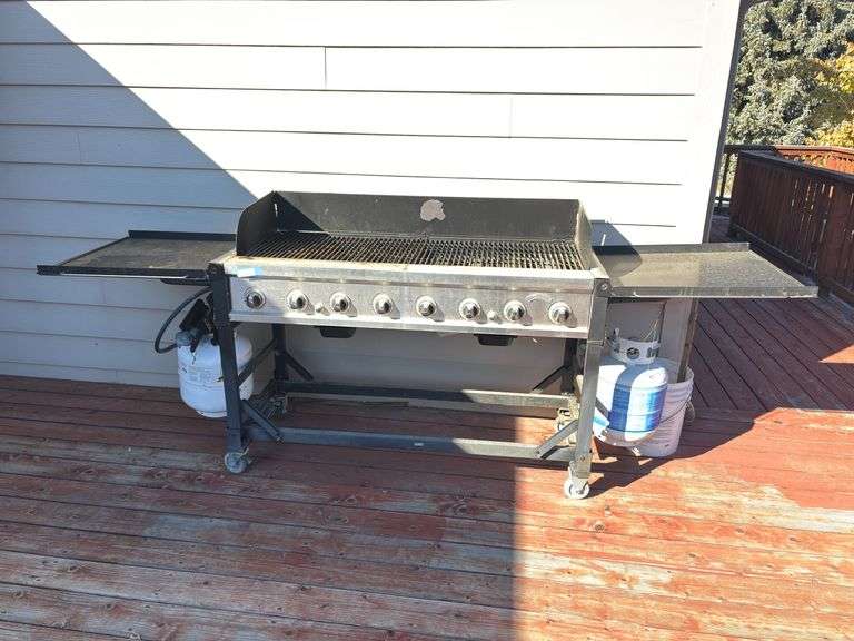Lot 621:Bakers and Chefs massive 1001 sq inch grilling capacity stainless steel master griller extraordinaire - 8 burners. Half is like new half could use a good cleaning. Cooks 65 hamburgers or 126 hotdog!!! you’ll be the most popular person in town - with two propane tanks and canvas cover