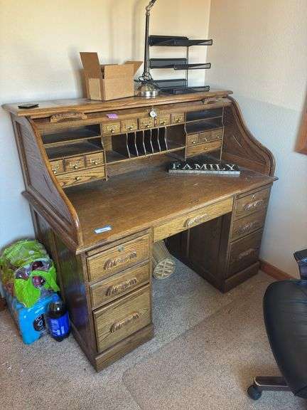 Lot 562:Locking Oak roll top desk with office chair and floor mat desk is 53 x 28 x 48