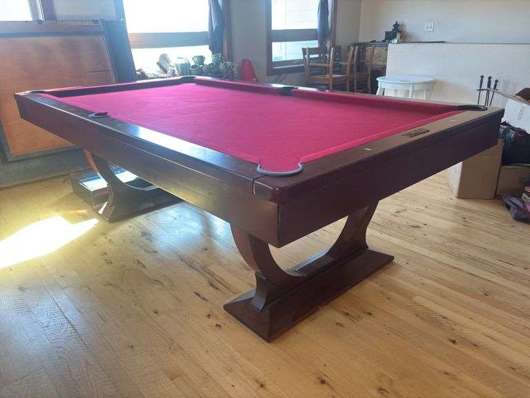 Lot 100:Presidential Billiards LP cherry FULL SIZED, slate billiards table with very heavy duty wood table cover. Approx 9' x 6') Please bring lots of help or contact a professional moving company. This is on the main level.