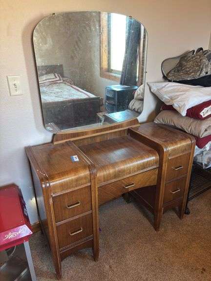 Lot 584:Vintage mid-century waterfall vanity table with mirror 43.5 x 18