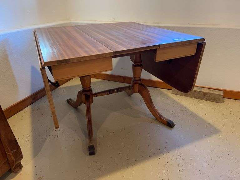 Lot 650:Duncan Phyfe leg double drop leaf dining room table with additional 12 inch leaf 38x38 with two 16” drop downs